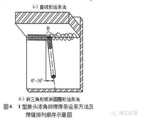 采用單層焊,用直線形和往復(fù)形的運條方法;當(dāng)焊腳尺寸>6mm時,采用多層多道焊,第一層用直線形運條方法,其后各層可選用斜三角形或斜環(huán)形運條方法,如圖6所示。
