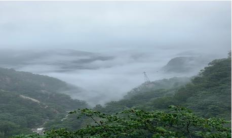 此次旅程一開(kāi)始就充滿了緊張刺激,蜿蜒的山路盤(pán)旋而上,坐在上山的大巴車上宛如坐過(guò)山車。一路上群山環(huán)繞,既是“蒨首見(jiàn)龍游,群山翠浪流”,也是冷疊群山闊,清涵萬(wàn)象殊。