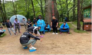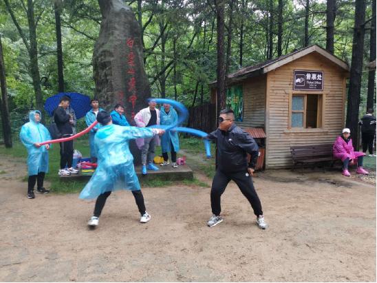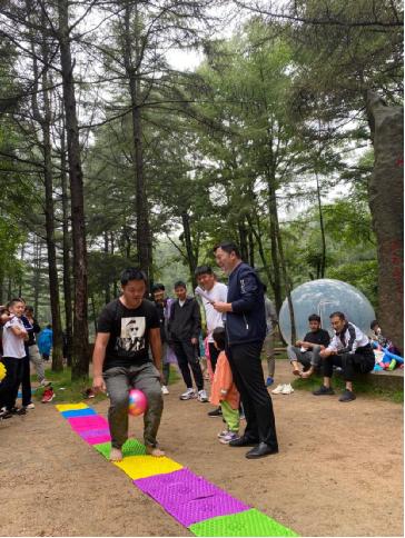 第二站到達(dá)的是森林氧吧。這是以森林、清泉、山石、溪澗、瀑布為基點(diǎn),以高含量的對(duì)人體健康極為有益的森林空氣負(fù)氧離子和植物精氣等生態(tài)因子為特色,輔以各類簡(jiǎn)約、樸素且與環(huán)境格調(diào)相一致的游憩設(shè)施。于是就在這里做起了團(tuán)建活動(dòng)。本著友誼第一,比賽第二,消除隔閡、提高團(tuán)隊(duì)協(xié)作能力提高凝聚力的宗旨,開(kāi)展了“帶球大沖關(guān)”、“摸石頭過(guò)河”、“蒙眼互打”三項(xiàng)競(jìng)技活動(dòng)。
