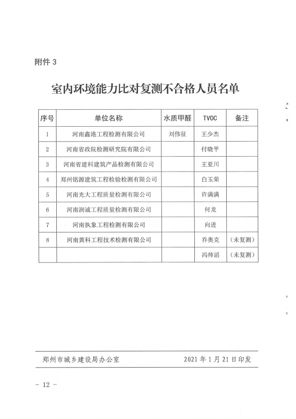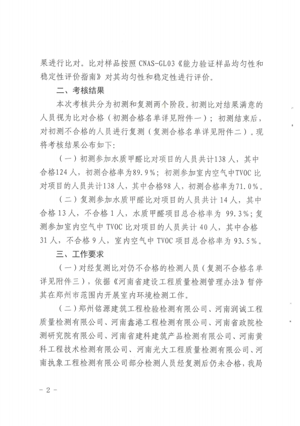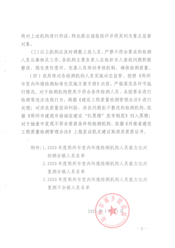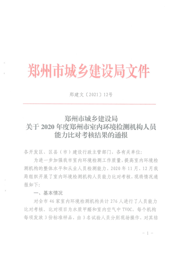 鄭州市城鄉(xiāng)建設(shè)局關(guān)于2020年度鄭州市室內(nèi)環(huán)境檢測機構(gòu)人員能力驗證結(jié)果的通報