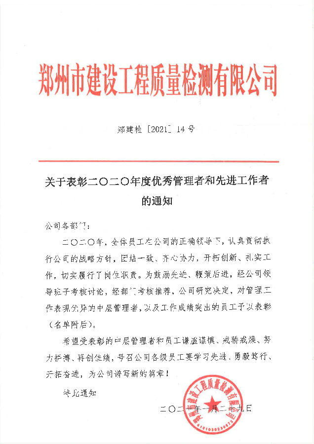 關(guān)于表彰二0二0年度優(yōu)秀管理者和先進工作者的通知