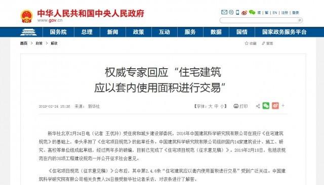 2019年的2月24日,新華社發(fā)布《權(quán)威專家回應(yīng)“住宅建筑應(yīng)以套內(nèi)使用面積進(jìn)行交易”》的文章,文中援引中國(guó)建筑科學(xué)研究院有限公司相關(guān)負(fù)責(zé)人的解釋稱:“住宅建筑應(yīng)以套內(nèi)使用面積進(jìn)行交易”這一條款的提出,在規(guī)范起草過(guò)程中,對(duì)國(guó)際國(guó)內(nèi)住宅面積計(jì)算做法進(jìn)行調(diào)研,按套內(nèi)使用面積計(jì)算是國(guó)際通行做法,而我國(guó)住宅面積計(jì)算方式主要采用建筑面積或套內(nèi)建筑面積。